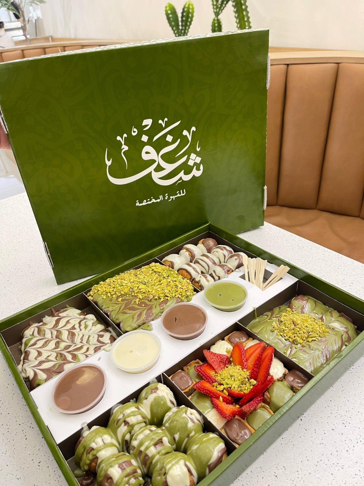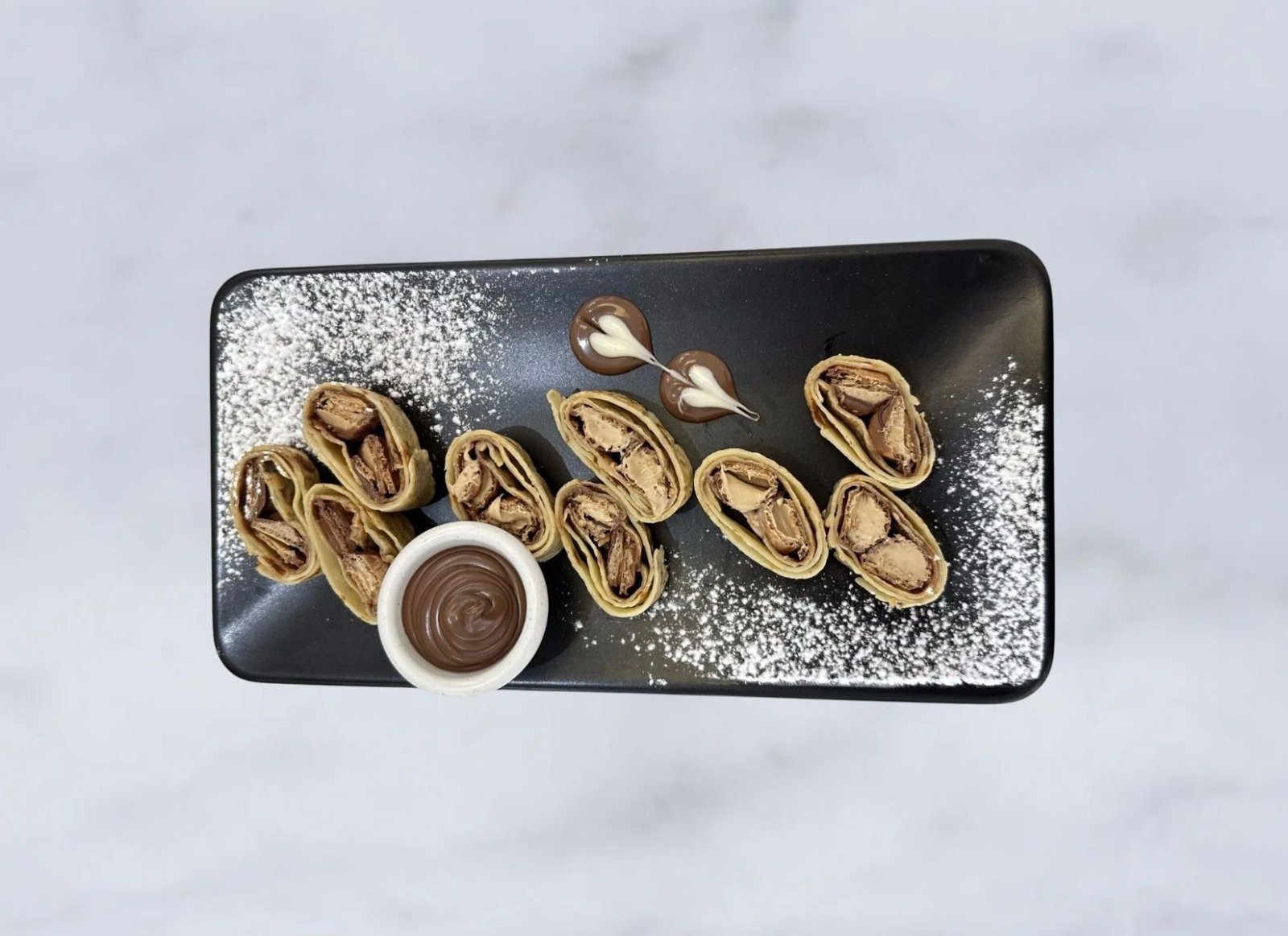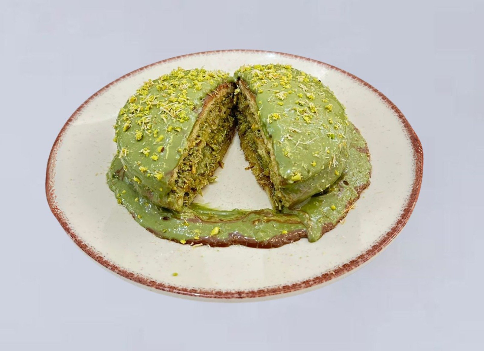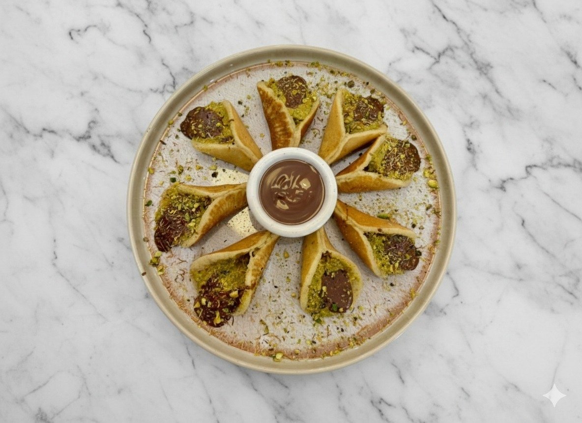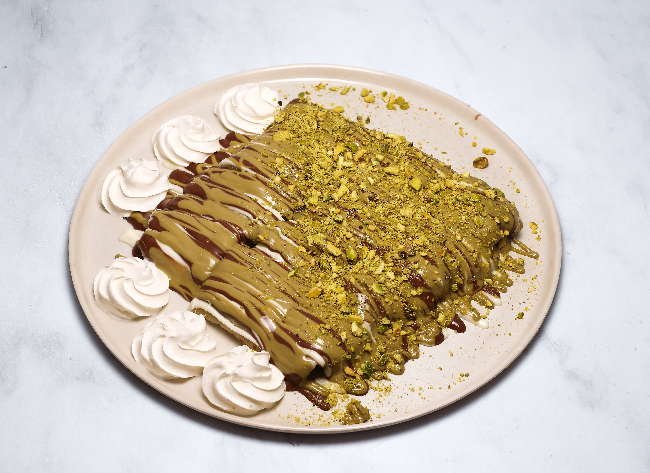8 قطع من القطايف المحشوة بالفستق الحلبي والكنافه يقدم مع صوص الشوكولاطه